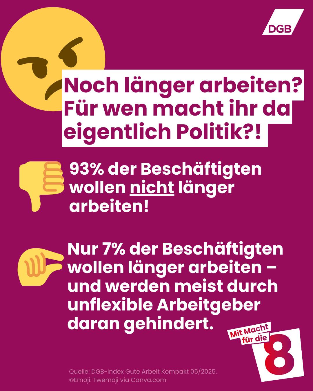 Der DGB und seine Mitgliedsgewerkschaften fordern die Bundesregierung auf, dem Druck von Arbeitgeberverbänden nicht nachzugeben. Die Gesundheit der Beschäftigten und der Schutz vor Überlastung haben oberste Priorität